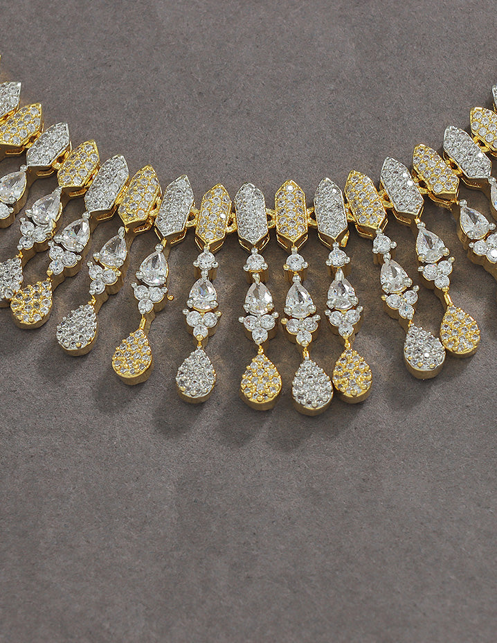 This Designer Zirconia Elegance Necklace Set features exquisite white stones set in a refined gold and rhodium polish, offering timeless sophistication. Perfectly crafted to elevate any ensemble with expert attention to detail and lasting brilliance.