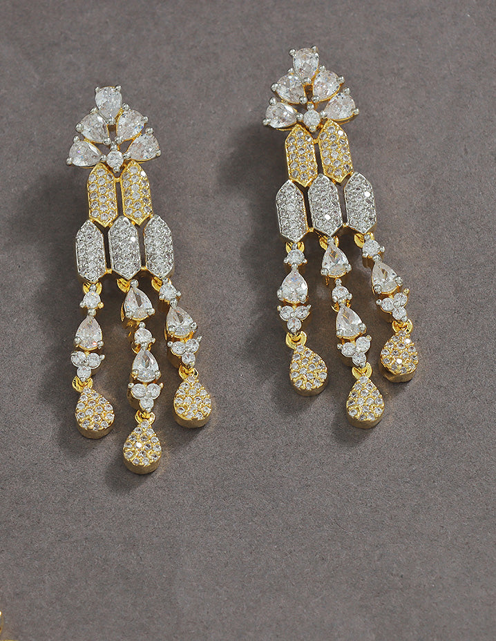 Elevate your style with this Designer Zirconia Elegance Necklace Set, featuring radiant white stones and a refined gold polish for timeless sophistication. Perfectly crafted to add a luxurious touch to any ensemble.