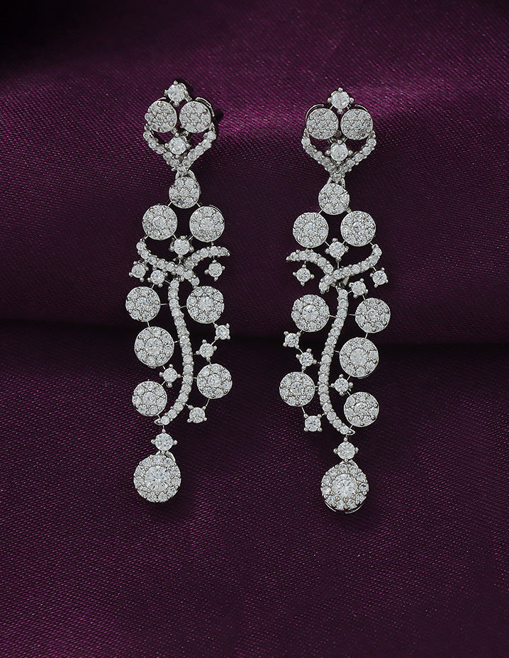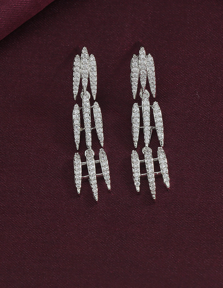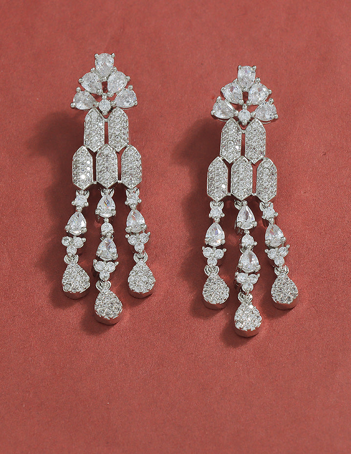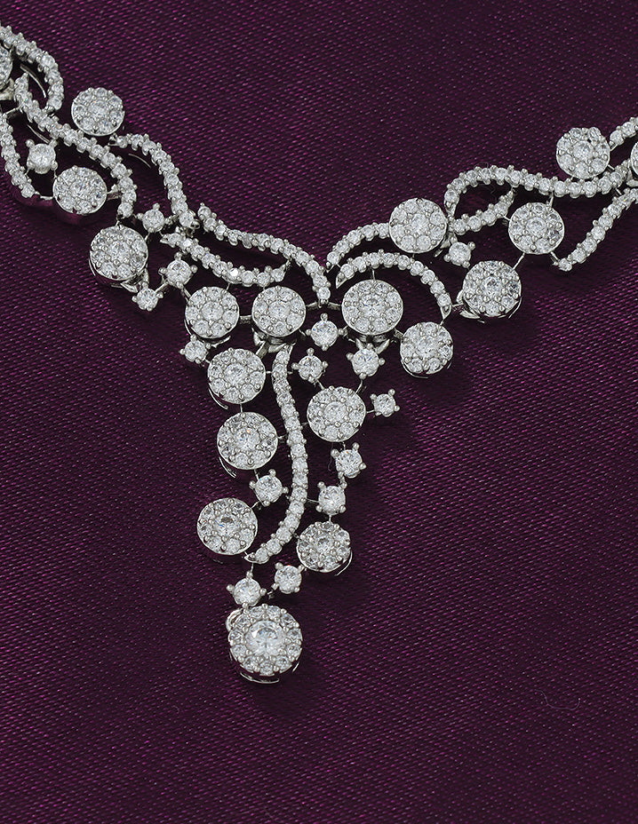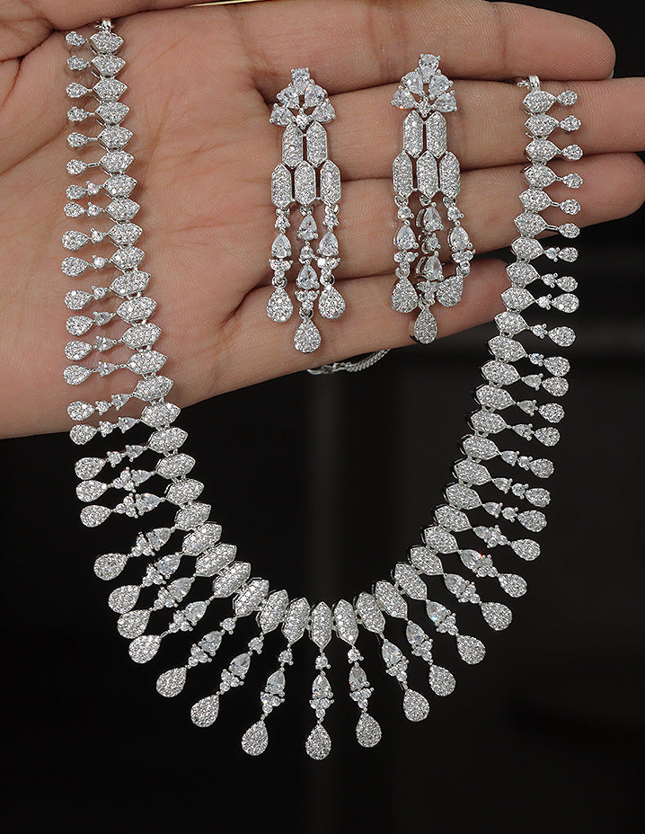 This Designer Zirconia Elegance Necklace Set features sparkling white stones enhanced by a durable rhodium polish. Its refined craftsmanship adds a sophisticated glow to any ensemble.