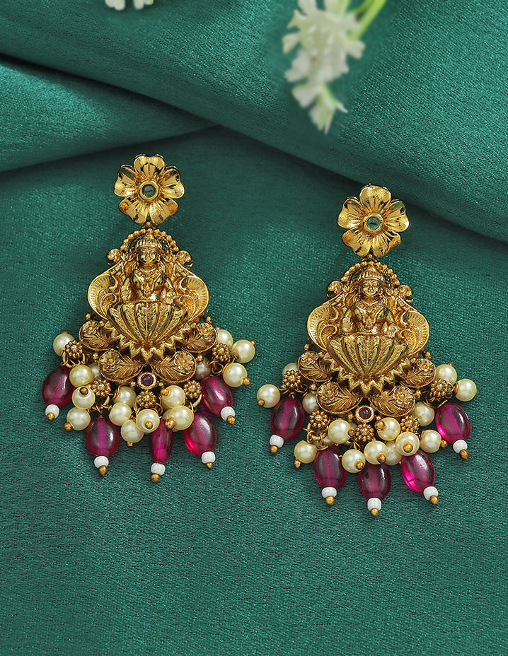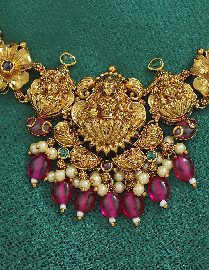 Designer Lakshmi Devi Necklace Set adorned with vibrant ruby kempu stones. Finished in a refined matt polish, showcasing intricate craftsmanship.