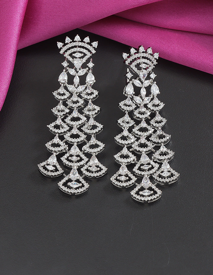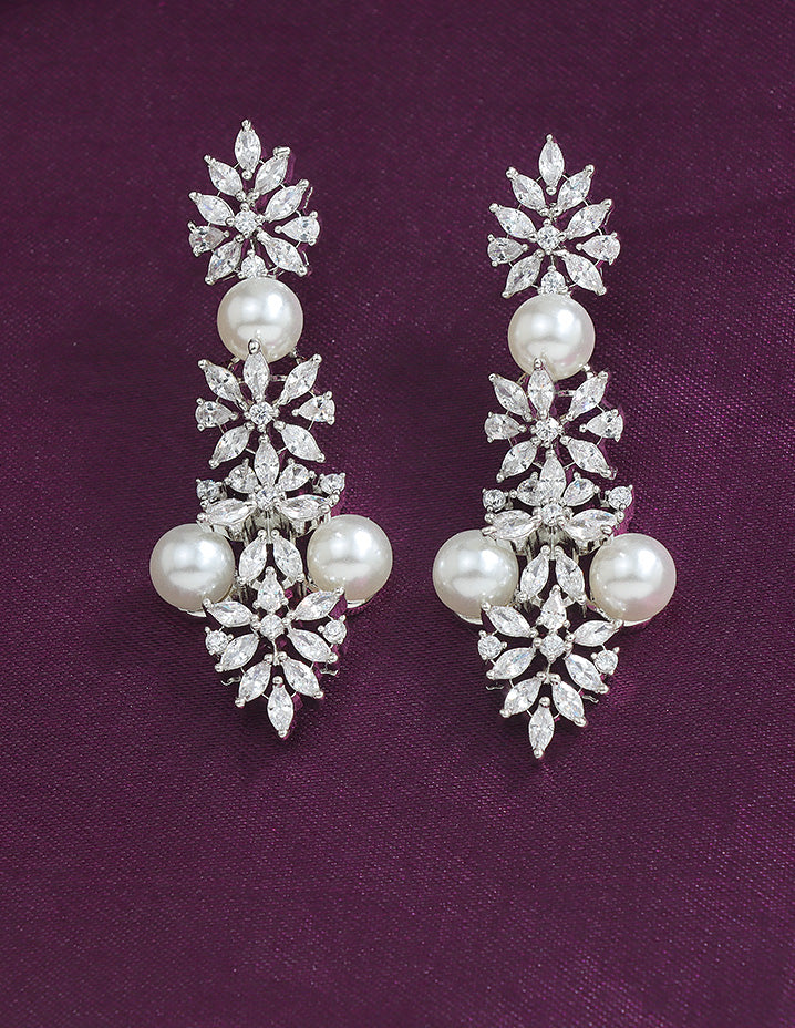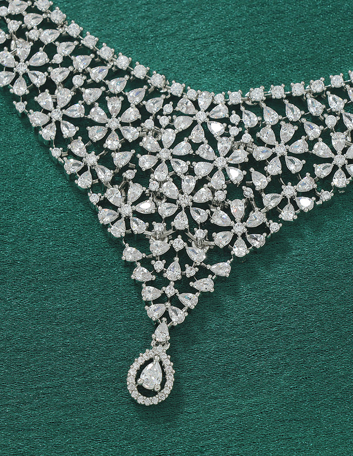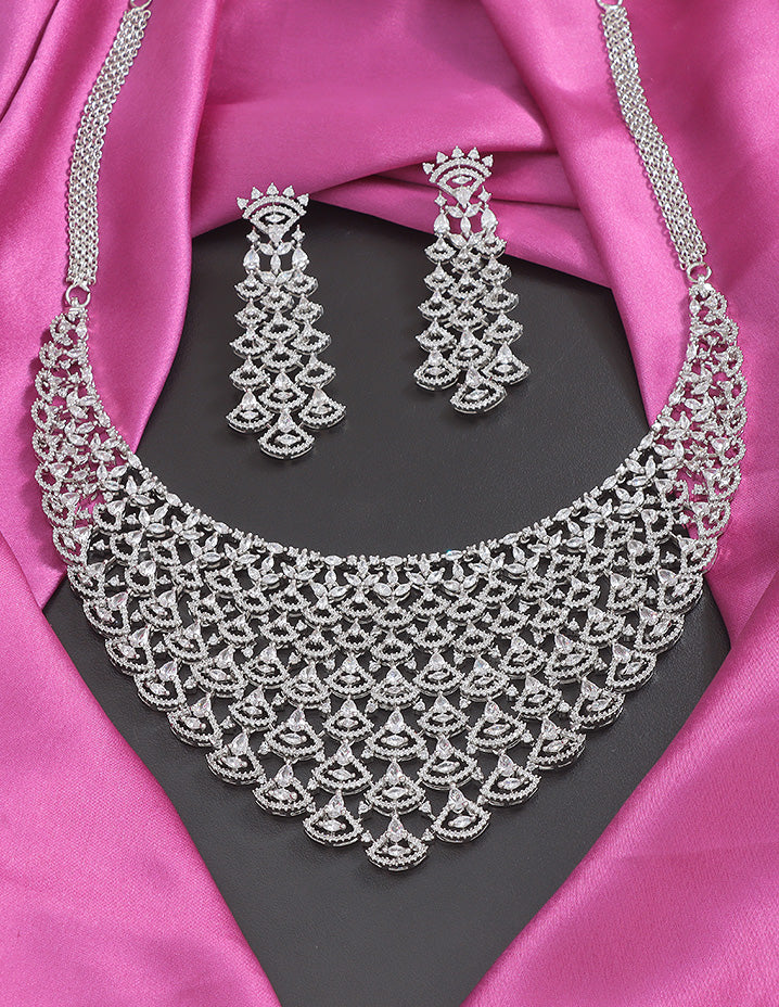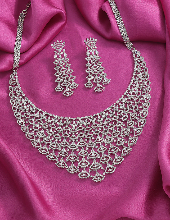 A radiant Rhodium-toned necklace and earring set adorned with sparkling Bud and floral motifs, perfectly blending elegance and charm for your special occasions.