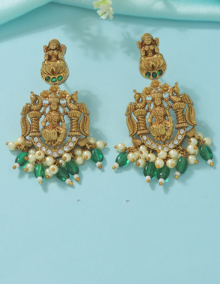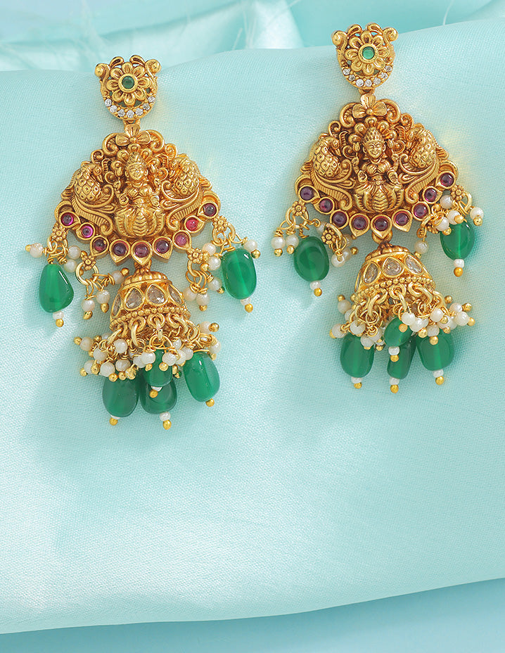 Elevate your bridal ensemble with this Designer Lakshmi Devi Necklace Set, featuring a matt antique polish for timeless elegance. Crafted with intricate detailing and adorned with vibrant green beads arranged in two graceful lines, this set beautifully honors tradition while enhancing your regal look. Perfect for special occasions, it combines classic artistry with expert craftsmanship to complement your bridal attire effortlessly.
