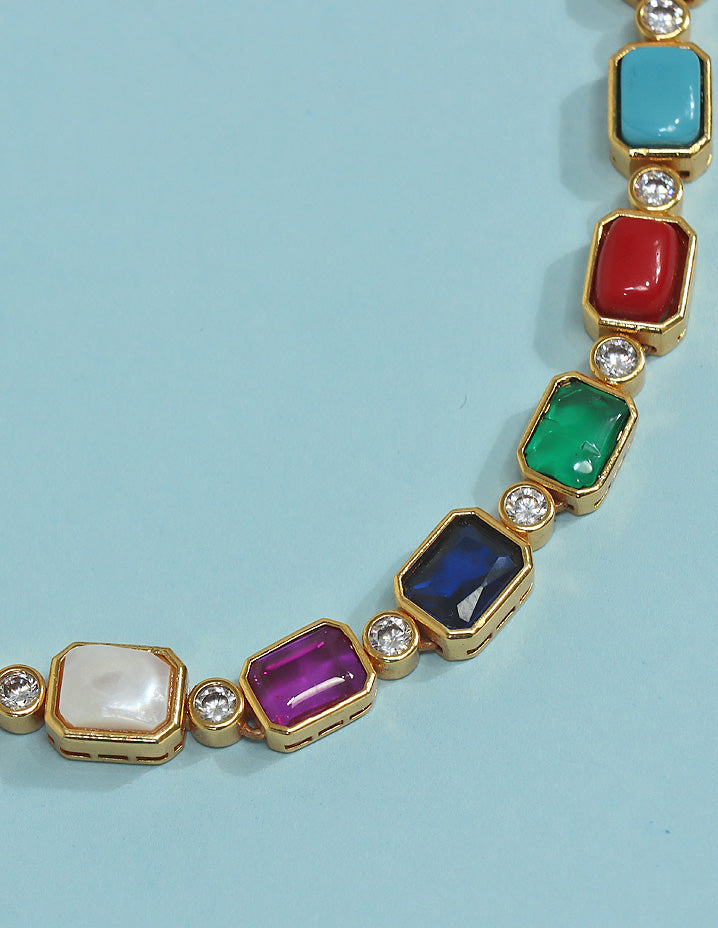 This Designer Matt Plated Navaratna Necklace Set showcases a stunning combination of traditional and contemporary design. The gold-plated necklace features nine precious gemstones, believed to bring protection and good fortune to the wearer. Elevate any look with this exquisite and meaningful piece.