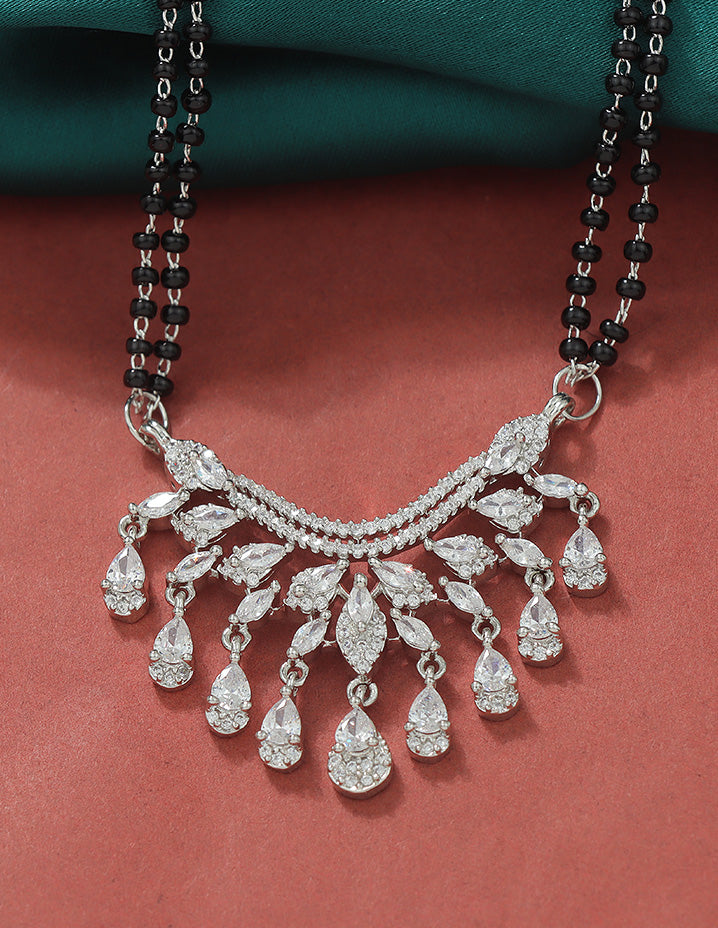This Designer Black Beads Mangalsutra with rhodium polish adds a sophisticated touch to your party wear. Complete with matching earrings, it offers timeless elegance for special occasions.