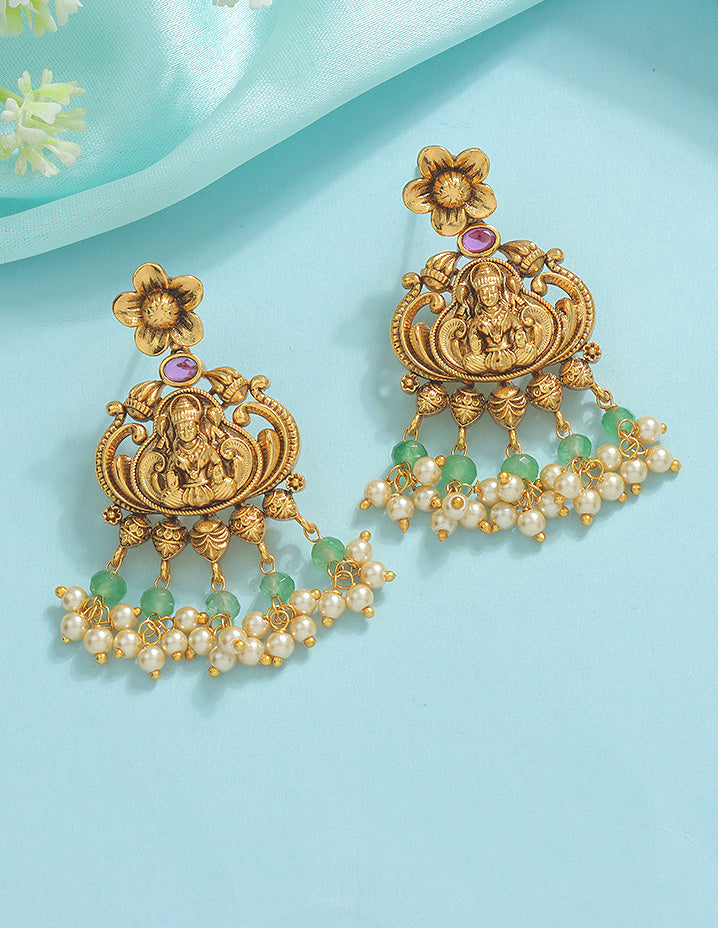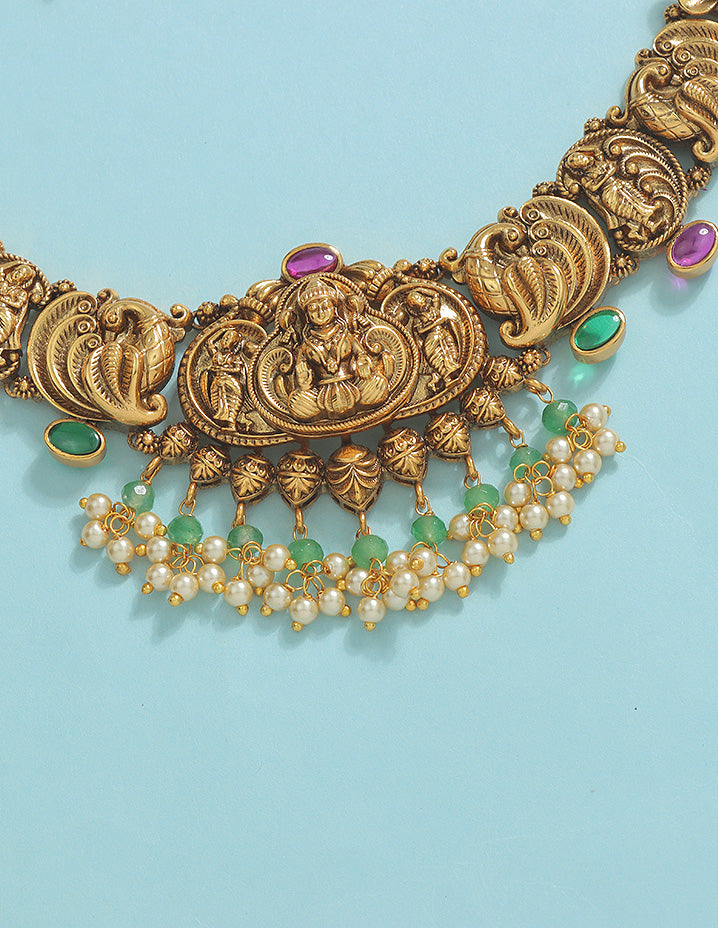 Elevate your traditional ensemble with the Designer Lakshmi Devi Necklace Set, featuring matt Kempu ruby and emerald tones for a regal look. Expertly crafted to embody elegance and divine charm in every detail.