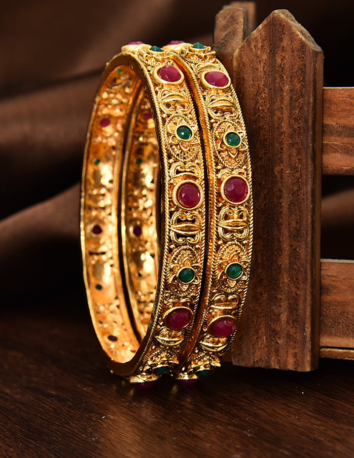 Premium matt-plated bangles with Ruby & Green Kempu stones. A perfect mix of tradition and style for any occasion!