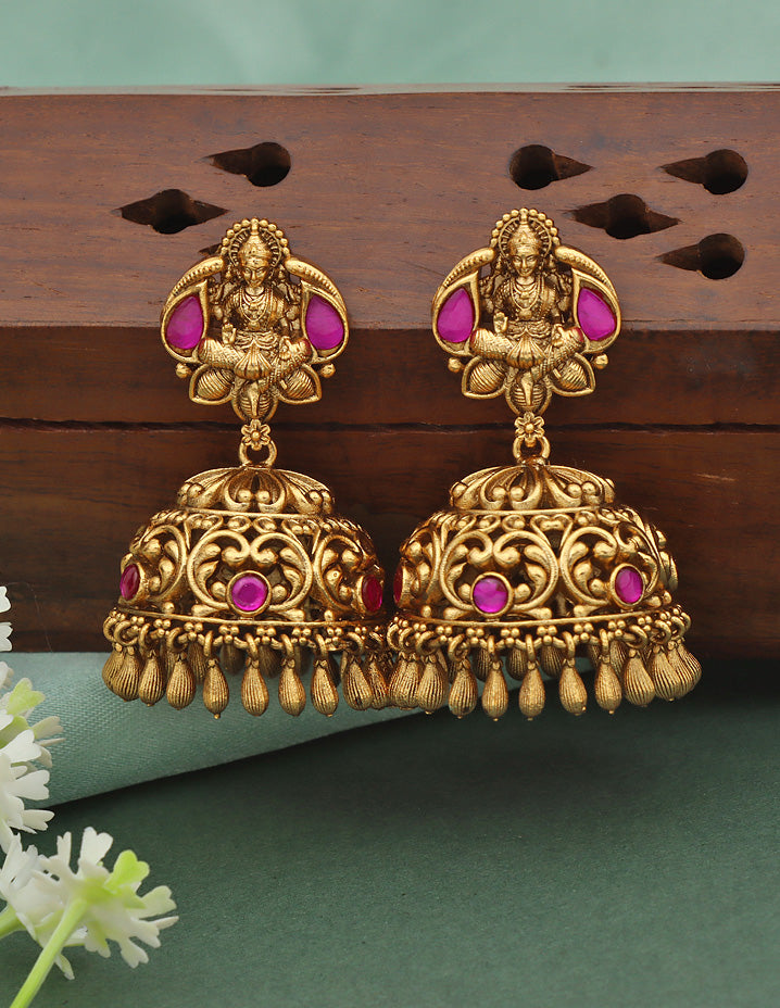 This Matt Kempu Lakshmi Devi Long Haram Set, featuring dazzling Rani Pink stones with gold beads, radiates timeless elegance. Paired with matching earrings, it’s the perfect accessory for any traditional occasion, making a bold and eye-catching statement.