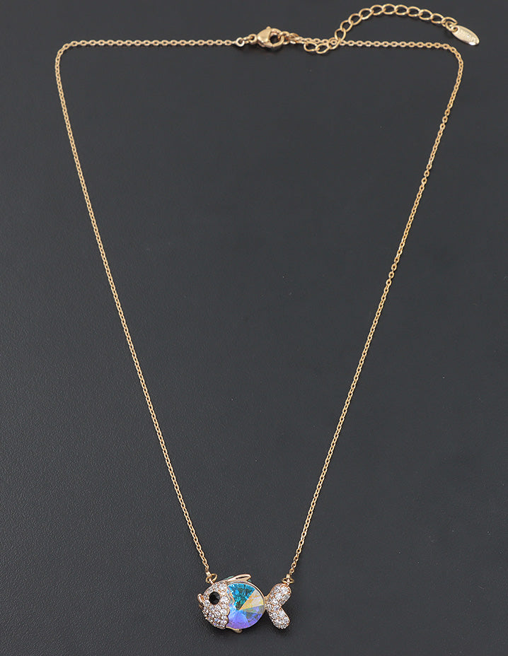 A cute and whimsical fish pendant with dazzling crystals and a golden finish — perfect to add charm and fun to any look!🐟✨