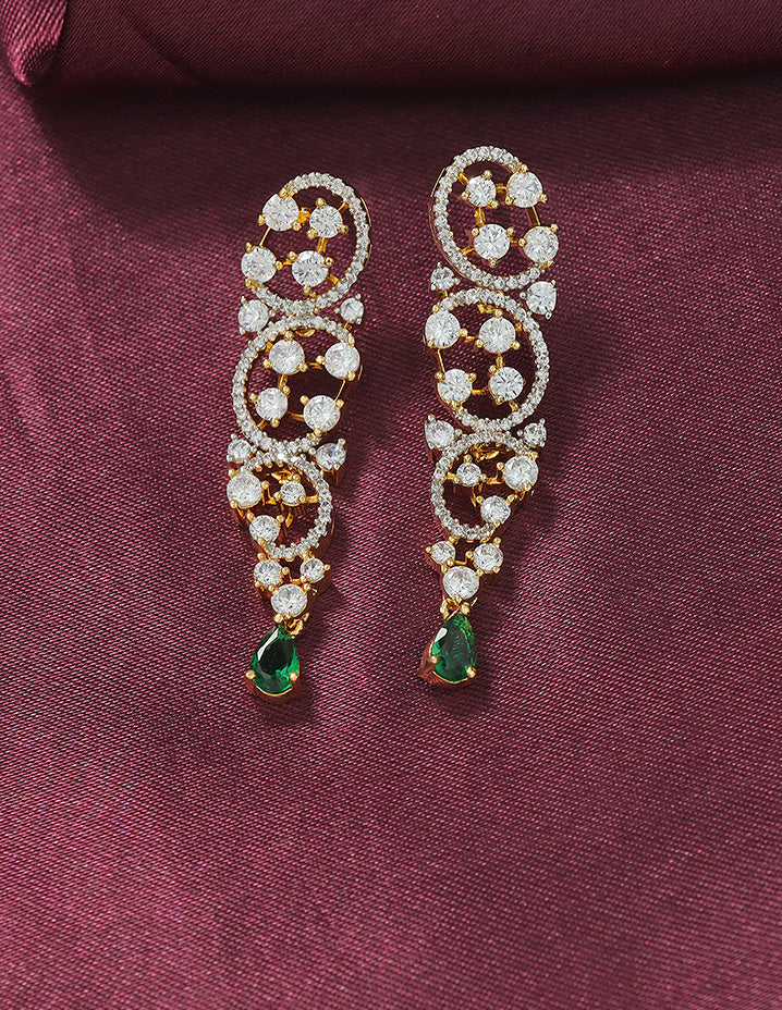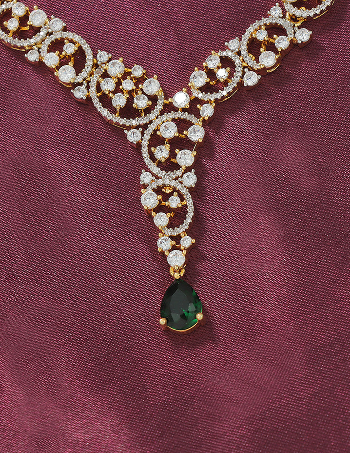 This Designer Zirconia Elegance Necklace Set features exquisite emerald and white stones set in a refined gold and rhodium polish, offering timeless sophistication. Perfectly crafted to elevate any ensemble with expert attention to detail and lasting brilliance.