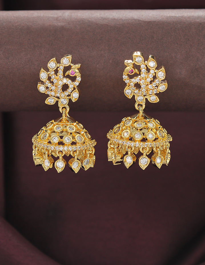 Designer earrings are classic jhumka-style danglers with a fusion of traditional and contemporary design. The bell-shaped drop is richly embellished with white stones and tear-drop dangles, paired with a sparkling oval top.