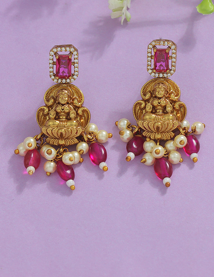A majestic gold-toned necklace set adorned with ruby red stones, finished with delicate pearl clusters. Perfect for weddings and festive occasions, this regal set includes a matching pair of statement earrings to complete your traditional ensemble.