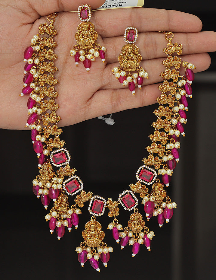 Designer Zirconia Royal Ruby Beads Kempu Necklace Set