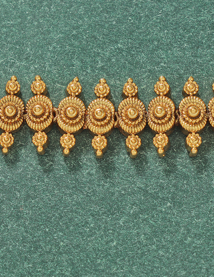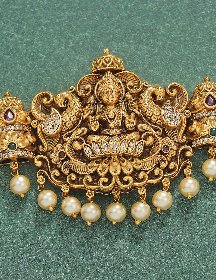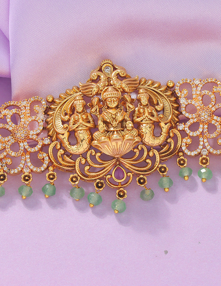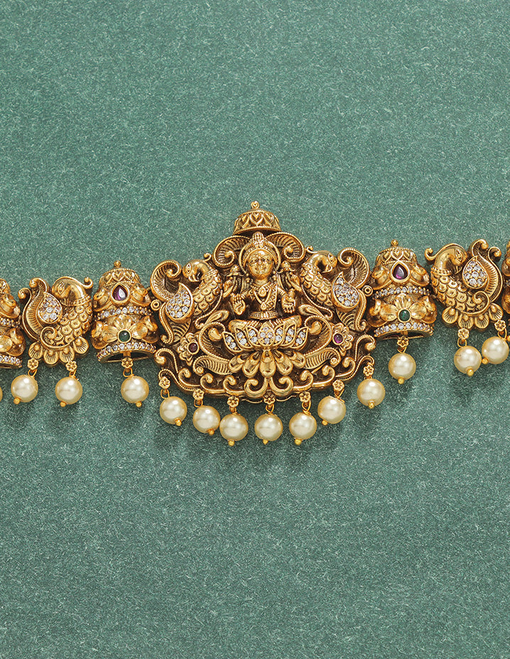 The Designer Matt Lakshmi Devi Beads Chain Vaddanam appeals to customers who value intricate zirconia detailing and traditional elegance. It meets the demand for ornate, culturally significant jewelry with a modern designer finish.