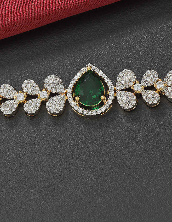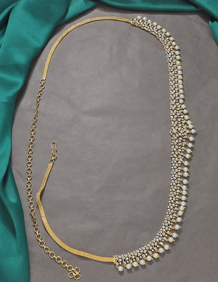 This Designer GJ Polish Zirconia Chain Vaddanam combines a sleek gold and rhodium polish with sparkling emerald white stones, offering a graceful and enduring accessory that enhances traditional elegance.