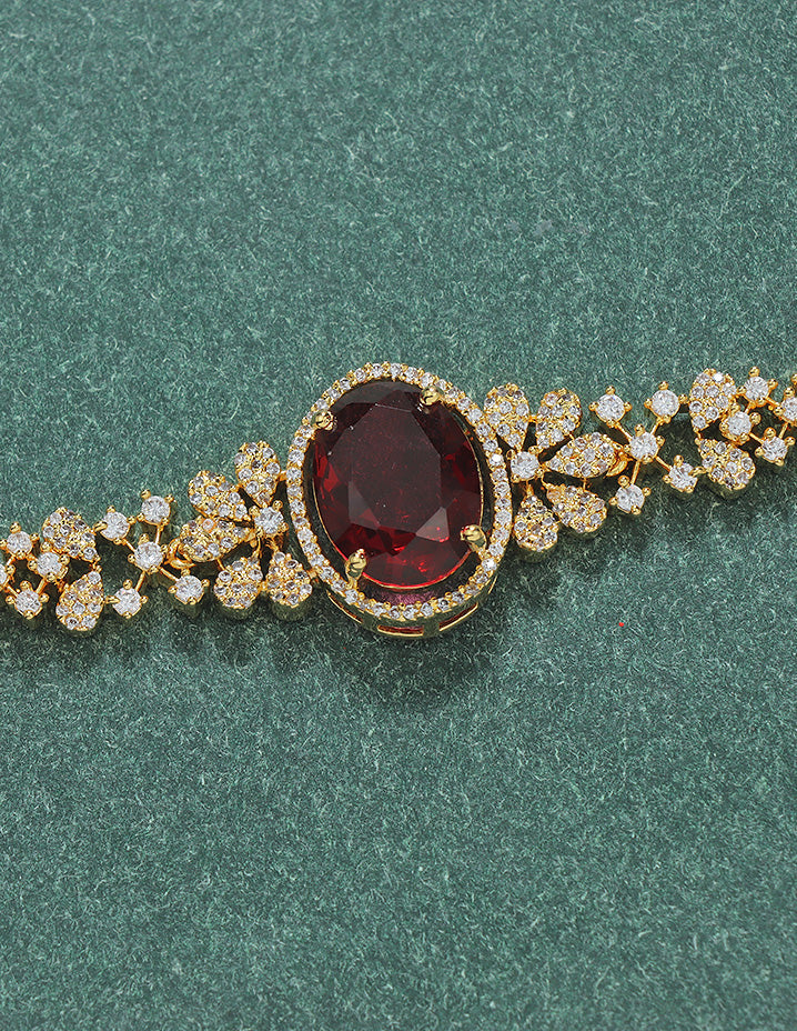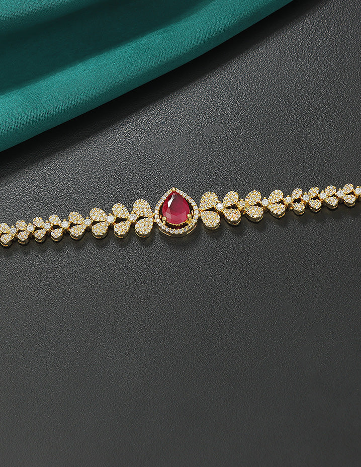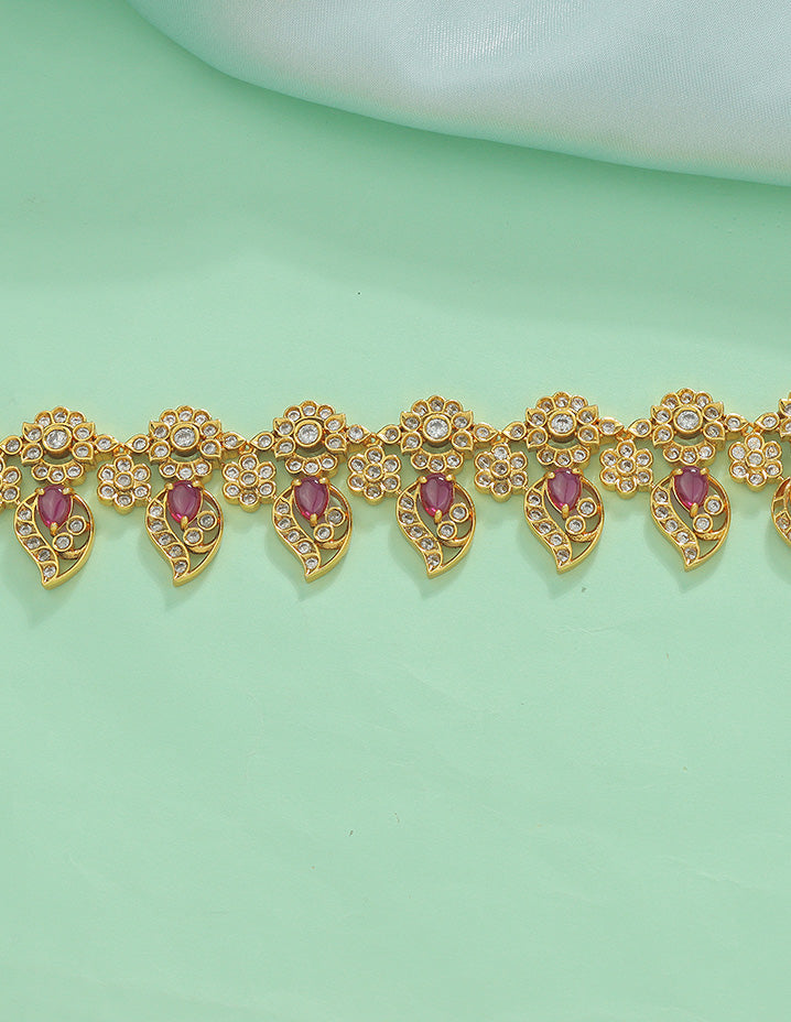 This Designer Zirconia Mango Shape Chain Vaddanam features ruby and white tones with a sophisticated gold matt polish, appealing to customers who value elegant and timeless ethnic jewelry. It is crafted for those seeking exquisite detail and lasting comfort in their traditional accessories.