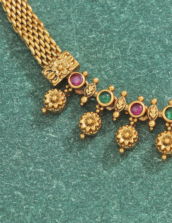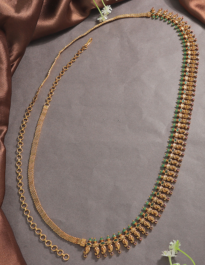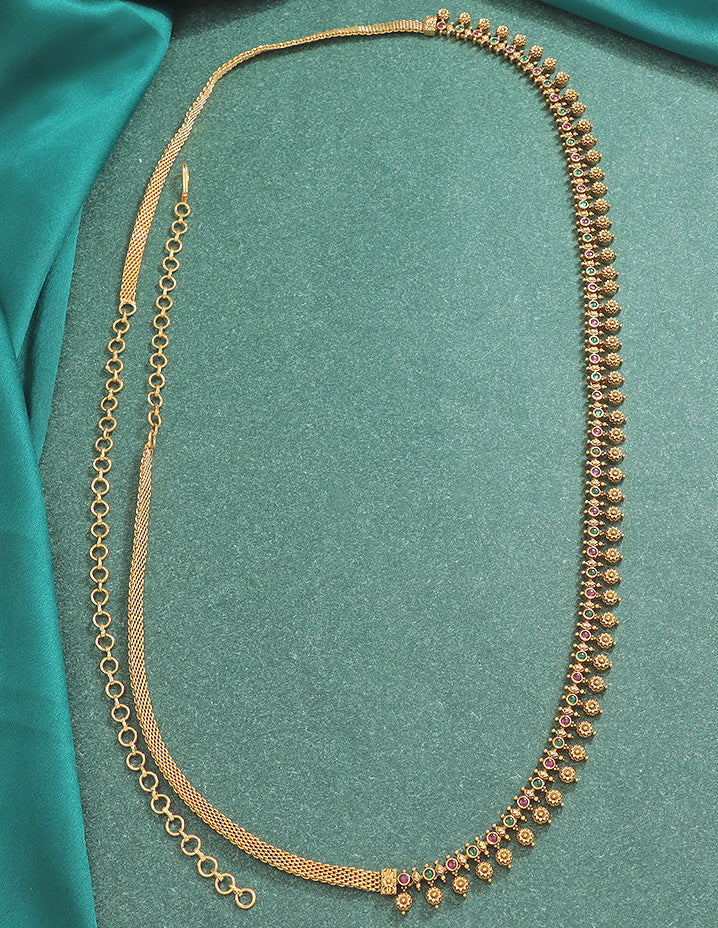 This Antique polish chain Vaddanam is equal parts chic and ethnic. The delicate design of the hip belt is what makes it stand out. Studded with rubies and emerald green stones, this Vaddanam is something you can style with a wide variety of outfits. Pair it with an indo-western outfit and spill your creativity!