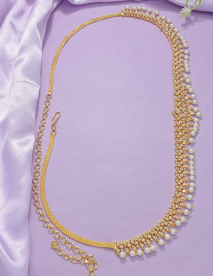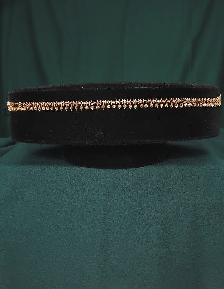 Delicately designed with CZ stones, this chic and ethnic chain Vaddanam adds a touch of elegance to any outfit. Perfectly pairs with a variety of styles, unleash your creativity with this hip belt.