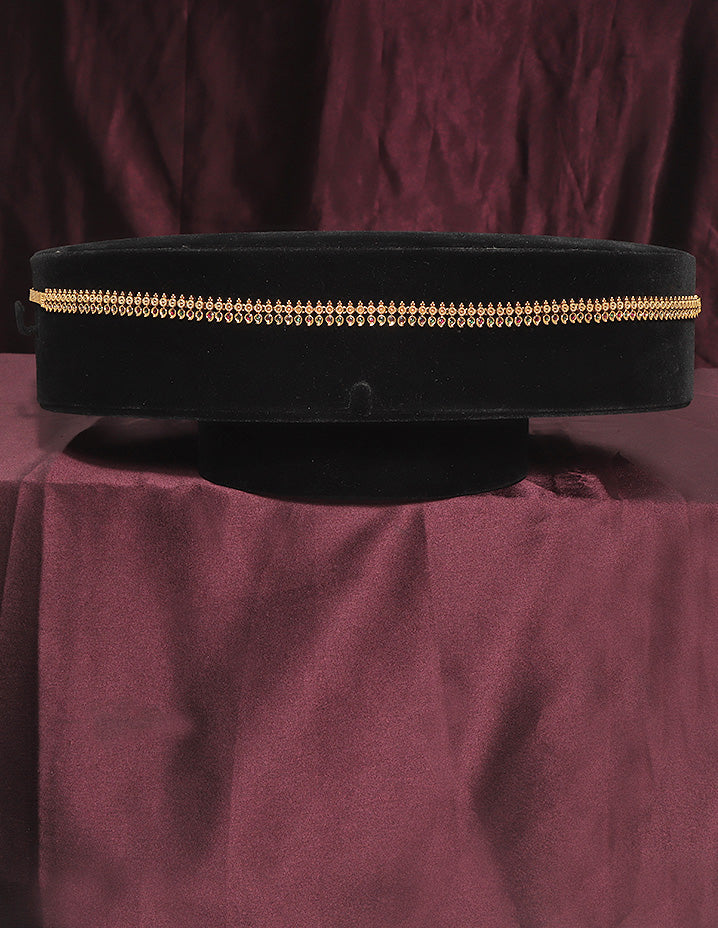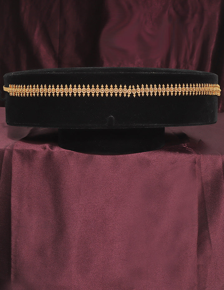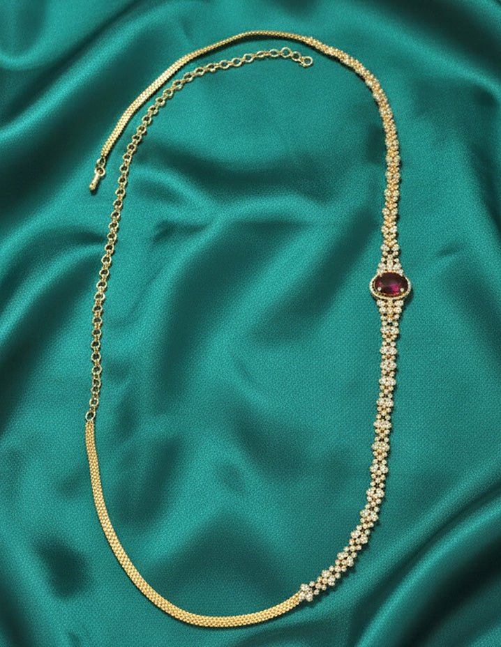This Designer gold Polish Zirconia Chain Vaddanam combines a sleek gold polish with sparkling ruby white stones, offering a graceful and enduring accessory that enhances traditional elegance.