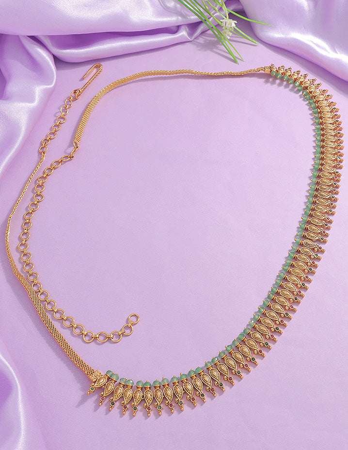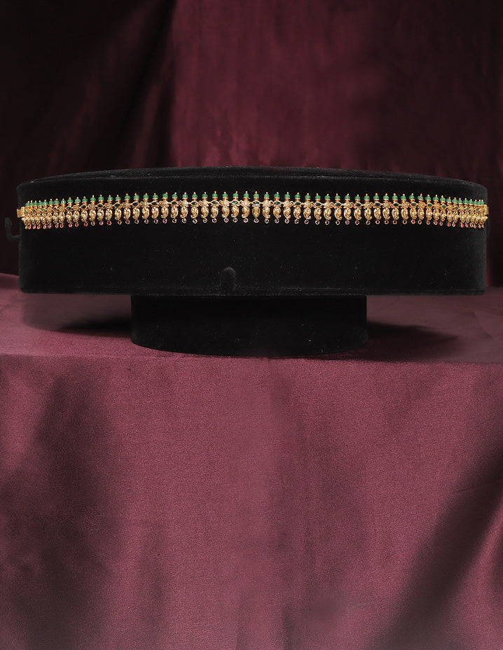 This Matt Chain Vaddanam has a chic and ethnic design. Adorned with CZ Stones, Pearls and green Beads attached as a Hanging to look Beautiful , it can be styled with various outfits, including indo-western ones.