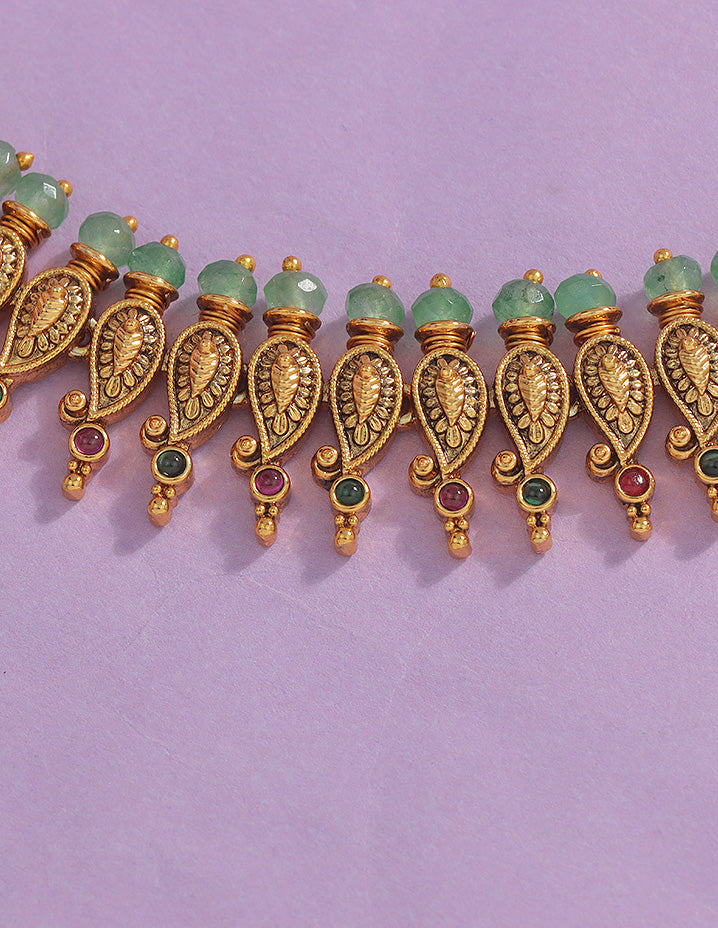 This Antique Chain Vaddanam has a chic and ethnic design. Adorned with CZ Stones, Pearls and green Beads attached as a Hanging to look Beautiful , it can be styled with various outfits, including indo-western ones.