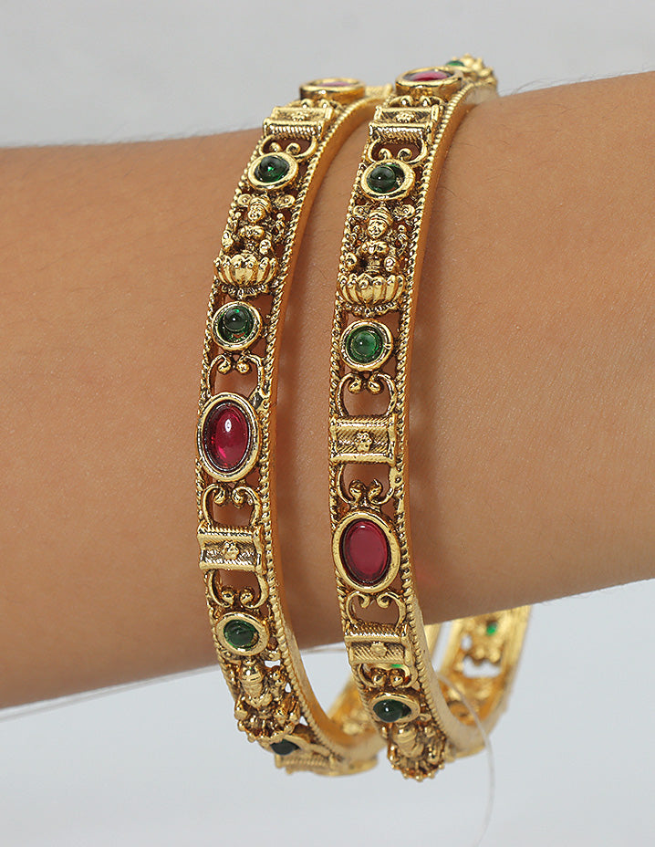 Elegant and timeless, these Designer Zirconia Bangles feature ruby, emerald, and white stones with a rich gold polish. A perfect pair for formal and special occasions.