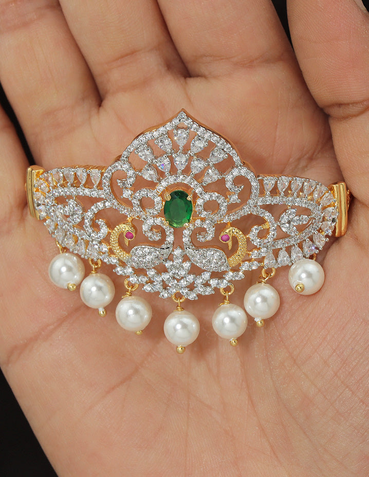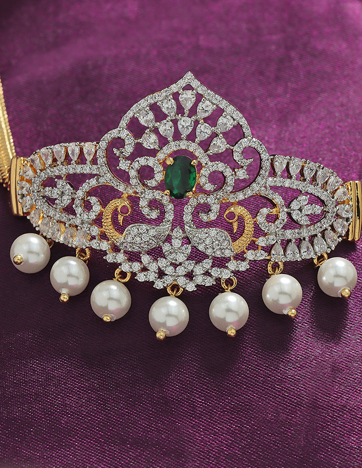 Elevate your style with this Designer Zirconia Chain Bajuband, featuring a GJ Polish Emerald and white design that adds elegance and durability with a stunning sparkle.