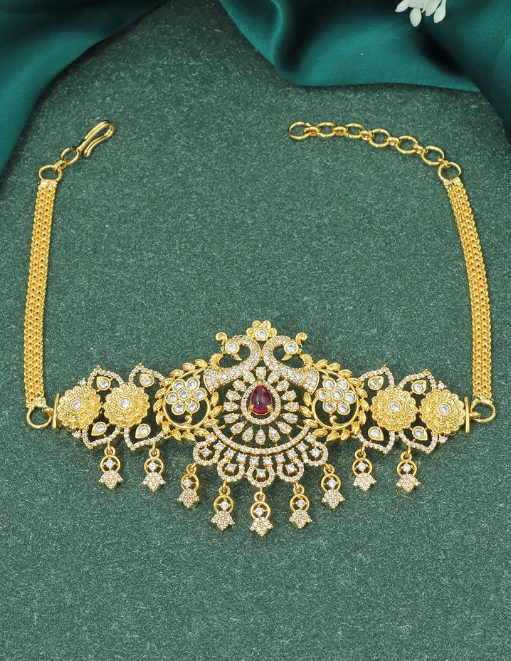 Upgrade your Bajuband with a stunning CZ one. Match it with any outfit and exude style. Featuring American diamonds, rubies stones, this Bajuband has a lustrous gold polish and a beautiful design.