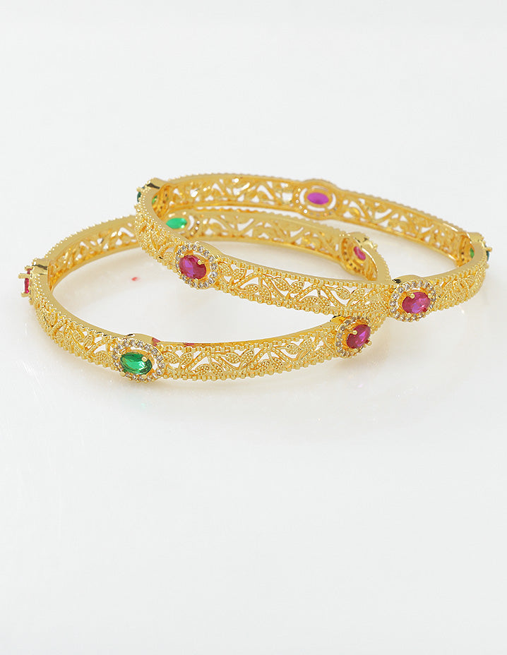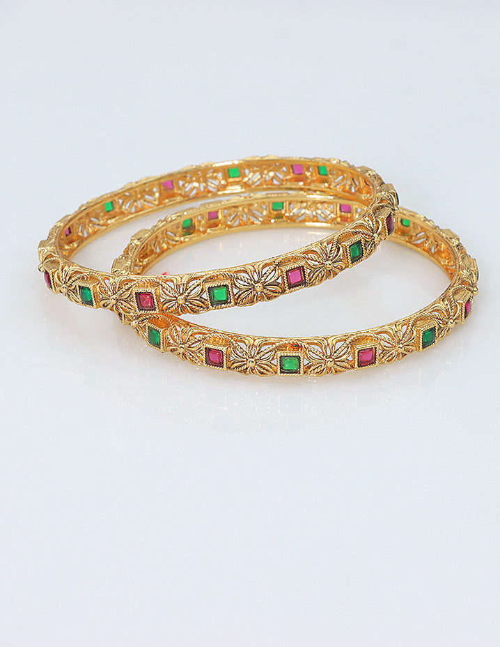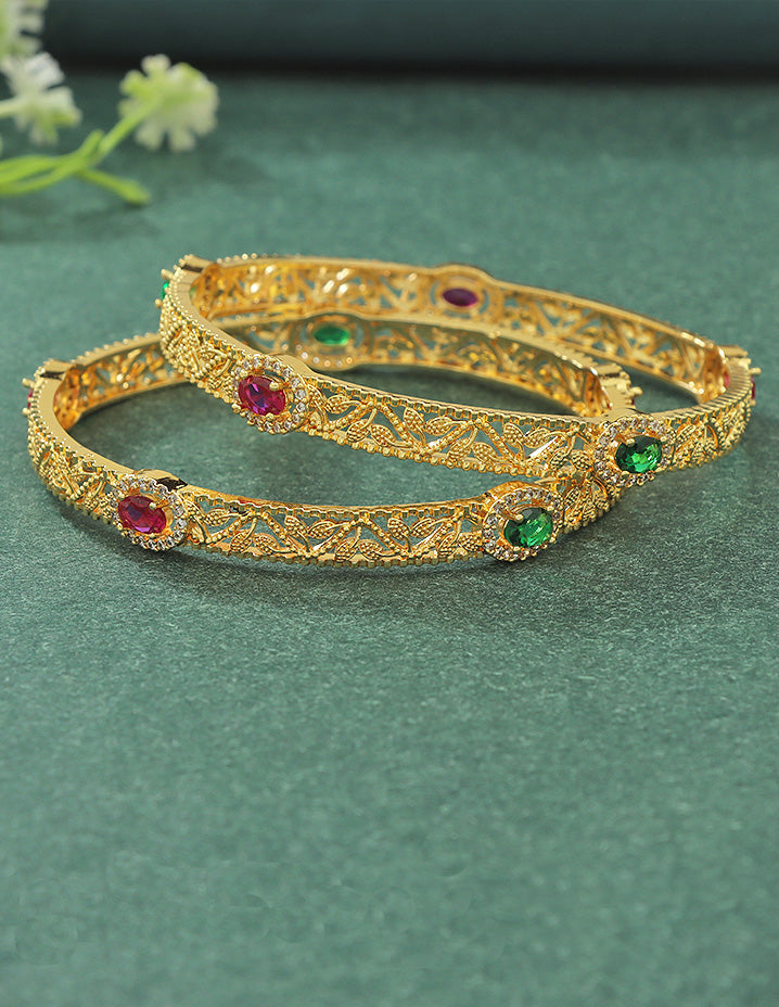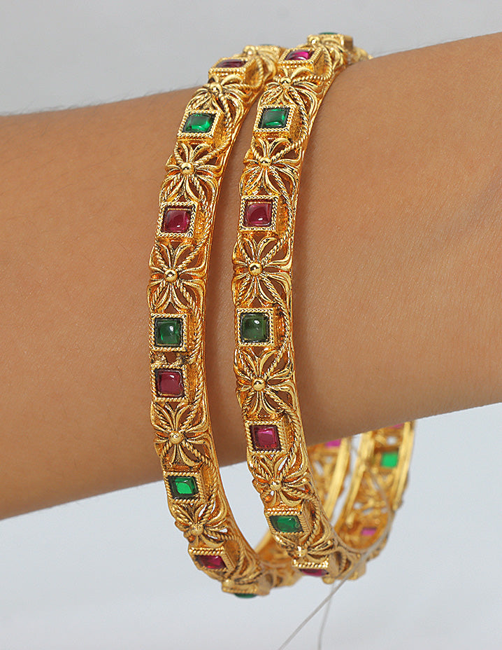 A stunning pair of gold-finish bangles adorned with intricate floral carvings and vibrant red and green stone accents—perfect for festive elegance or timeless tradition.