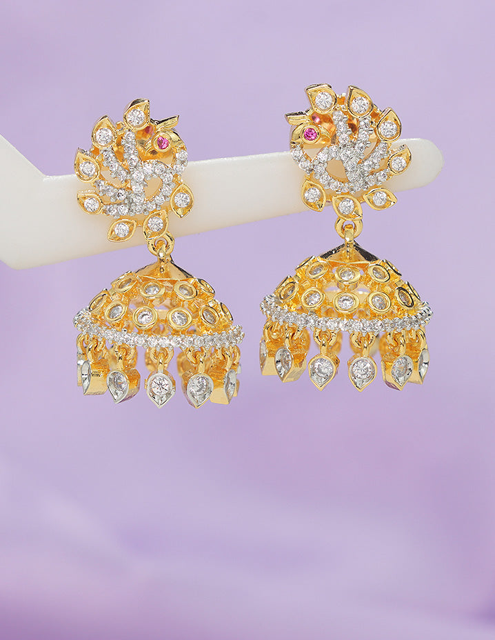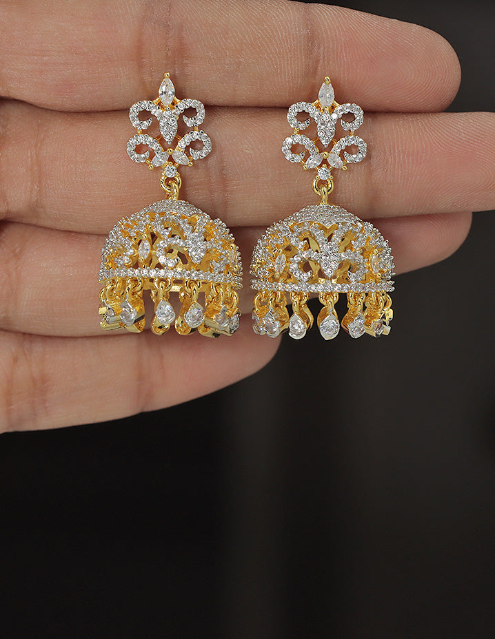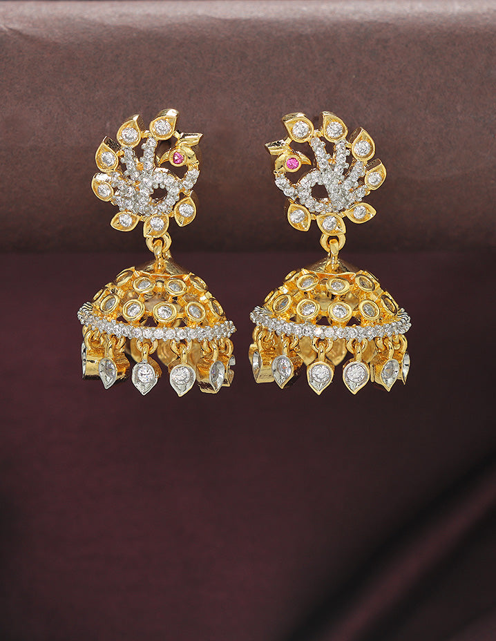 Designer earrings are classic jhumka-style danglers with a fusion of traditional and contemporary design. The bell-shaped drop is richly embellished with white stones and tear-drop dangles, paired with a sparkling oval top.