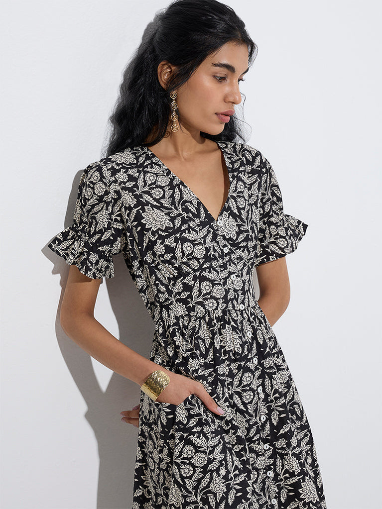 Bombay Paisley Black Floral Detailed Cotton A-Line Dress