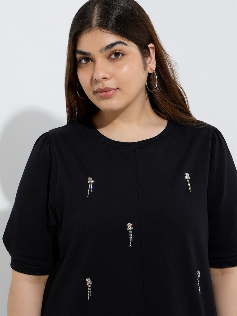 Gia presents this black A-line dress crafted from pure cotton for breathable comfort. Featuring subtle embellished detailing for a touch of shine, it is styled with a ribbed round neckline and half sleeves for a clean, contemporary finish.