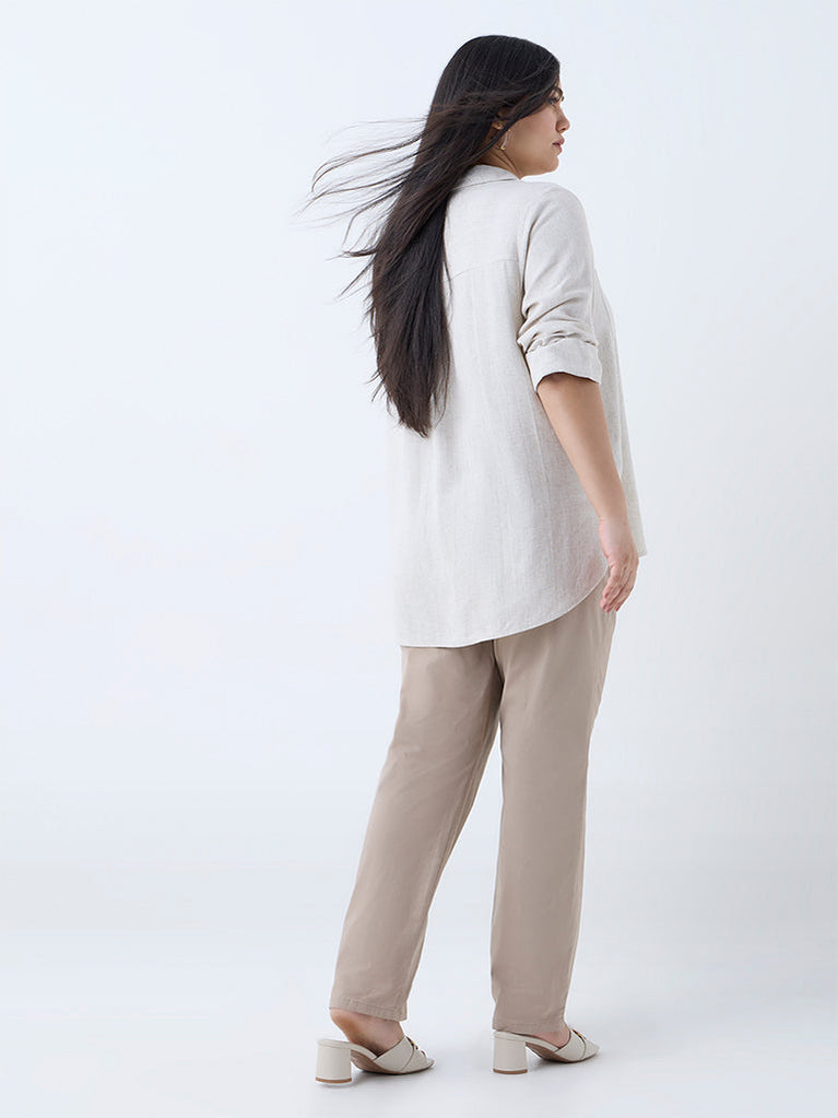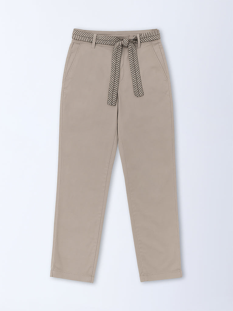 Gia Beige Solid High-Rise Cotton-Blend Pants with Belt