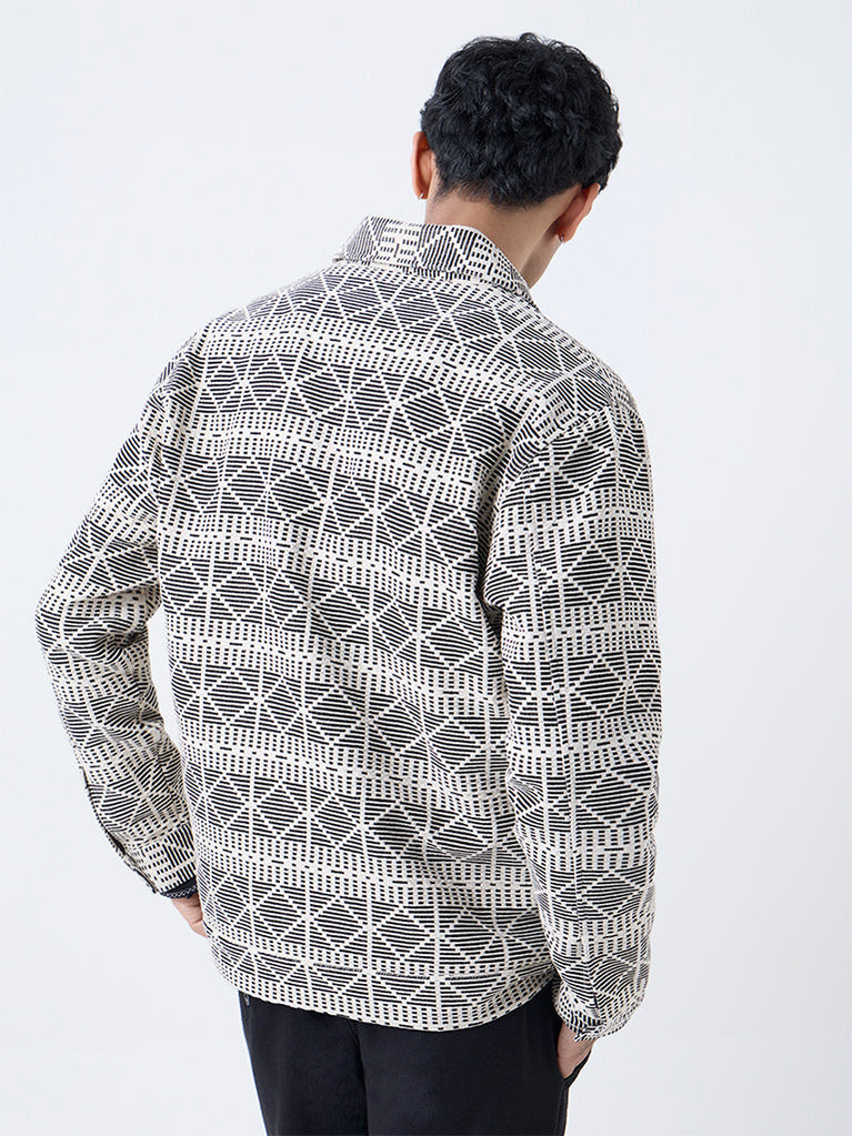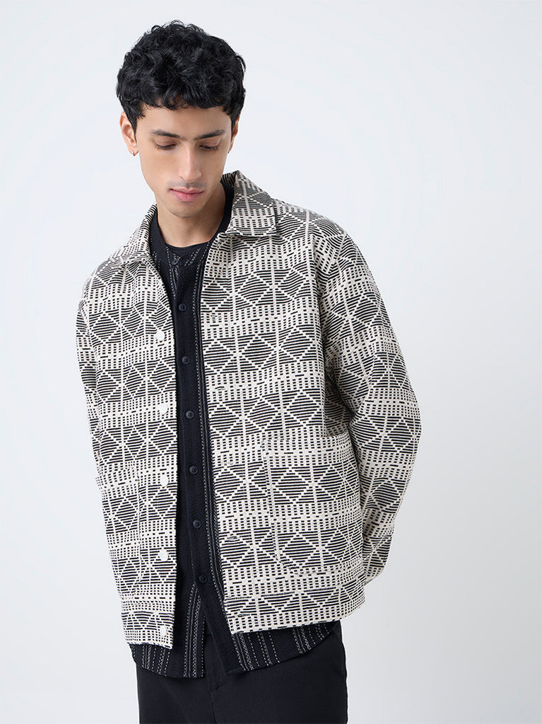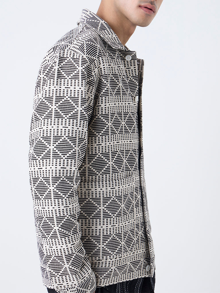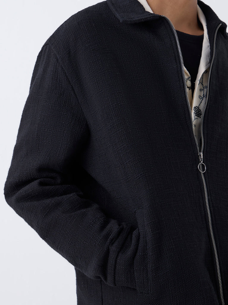 Get your dapper on with this black jacket from ETA, defined by a geometric embroidered exterior. Designed with a spread collar, a zipper front and full sleeves, it is balanced with dual welt pockets that add everyday utility. Cut from a pure cotton fabric with a lightweight feel, it stands out as a polished outerwear choice.