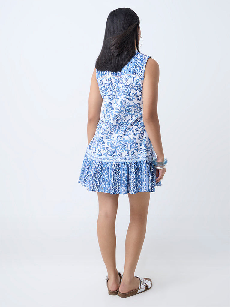 Bombay Paisley Blue Floral Detailed Cotton A-Line Dress