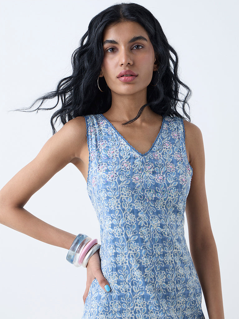 This blue dress from Bombay Paisley captures the ease of summer in a modern drop-waist silhouette. Scattered with floral prints, the pure-cotton creation features a flattering V-neck and a sleeveless cut for breezy comfort. A discreet side zipper ensures a smooth fit, making it the perfect piece to slip into for sun-drenched days.