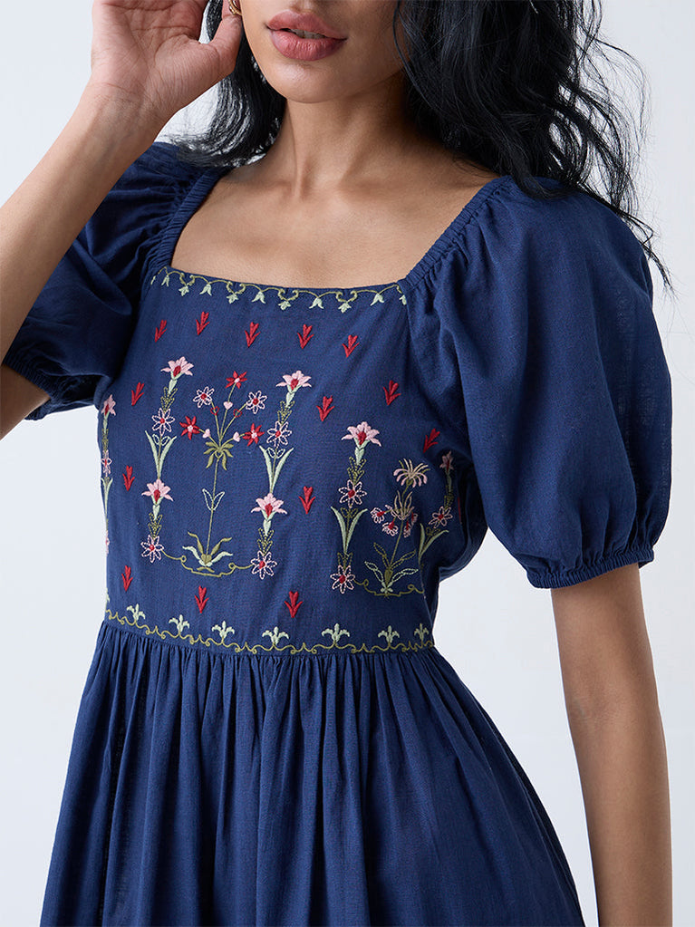 This dark blue dress from Bombay Paisley is elevated with vivid floral embroidery across the bodice, lending a handcrafted touch. Woven from breathable cotton, it’s framed with a square neck and puff sleeves, while gathered seams create a tiered, flowing skirt. A smocked back adds gentle stretch, making it a comfortable pick for Sunday plans and leisurely strolls.