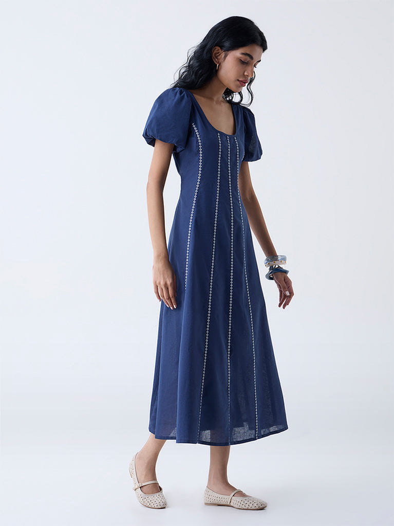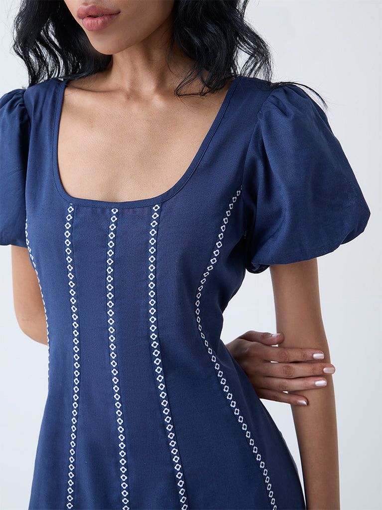 Bombay Paisley Dark Blue Embroidered Cotton A-Line Dress