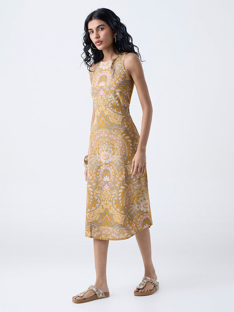A burst of bohemian energy, this mustard dress from Bombay Paisley is adorned with bold paisley prints that celebrate artisanal design. Cut in a fit-and-flare shape with a V-neck and sleeveless frame, it features a smocked back for comfort that moves with you.
