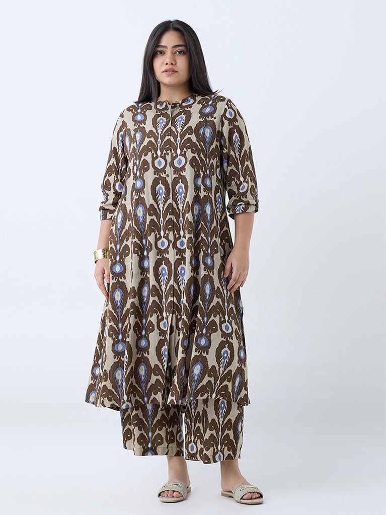 These brown ethnic pants from Diza bring a touch of earthy elegance to your festive occasions. Adorned with ikat-inspired motifs, they’re tailored from high-quality fabric that drapes beautifully over curves. The smooth elasticated waistband ensures all-day ease, while side pockets add practical charm.