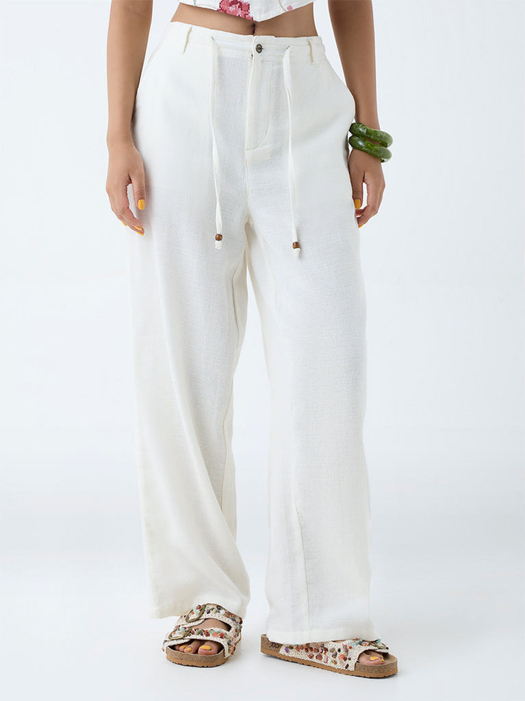 These off-white pants from Bombay Paisley blend everyday ease with understated charm. Woven from a cosy cotton-blend fabric, they feature a clean silhouette with an adjustable drawstring waistband for a comfortable fit. Multiple pockets complete the look with a touch of practical detail.