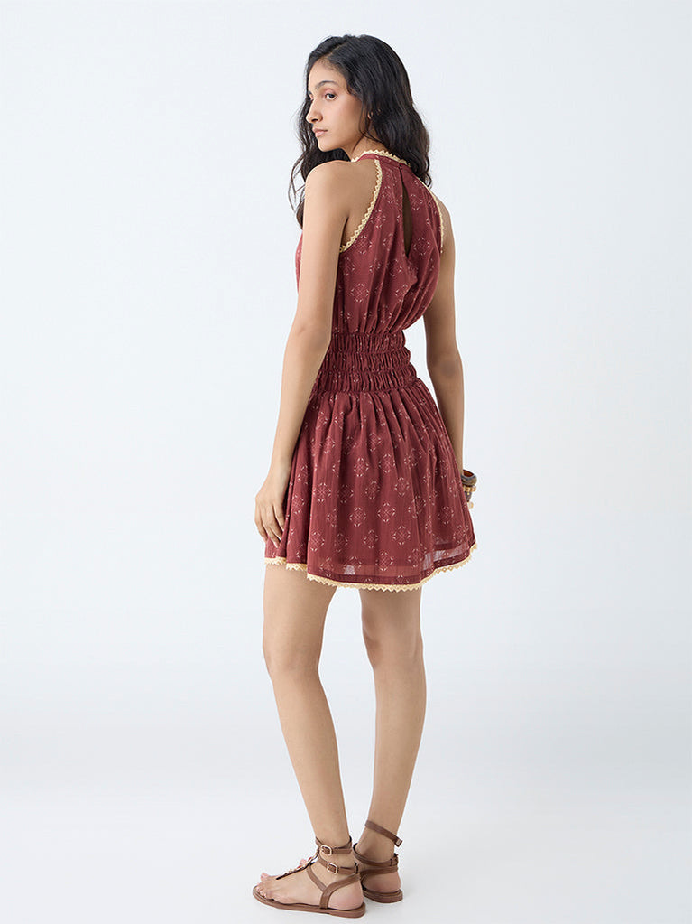 Upgrade your Indo-western wardrobe with this red dress from Bombay Paisley, adorned with ethnic-inspired motifs that lend a distinctive character to the design. Crafted from a cotton-rich fabric, it features a smocked waist that defines the silhouette, while a halter neck and sleeveless cut ensure comfort and breezy elegance.