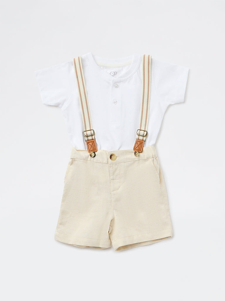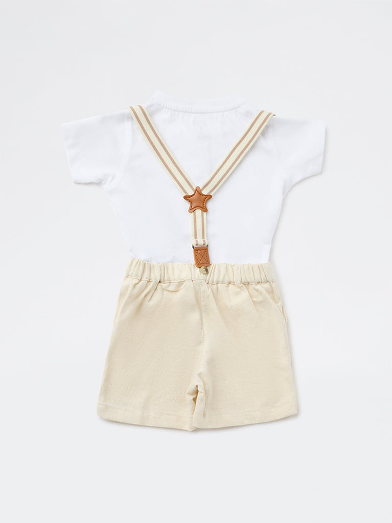 HOP Baby Boys White Cotton T-Shirt, Shorts and Suspender