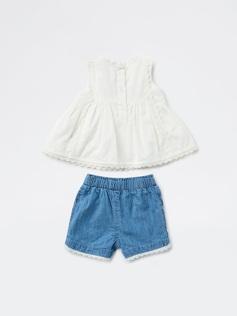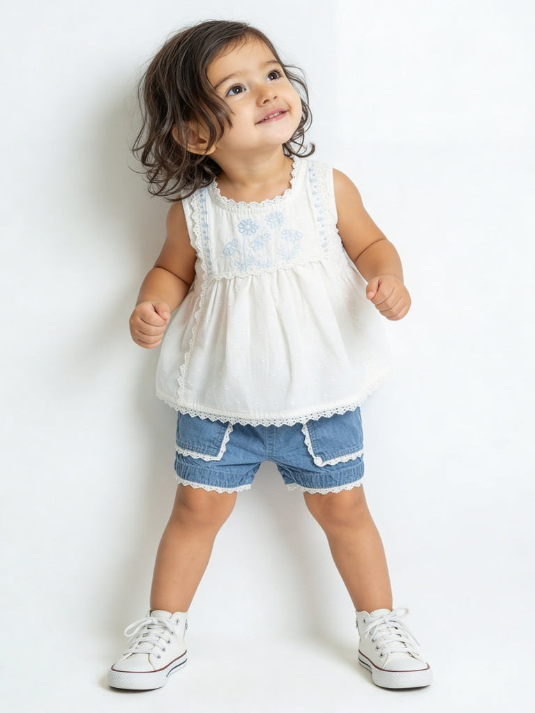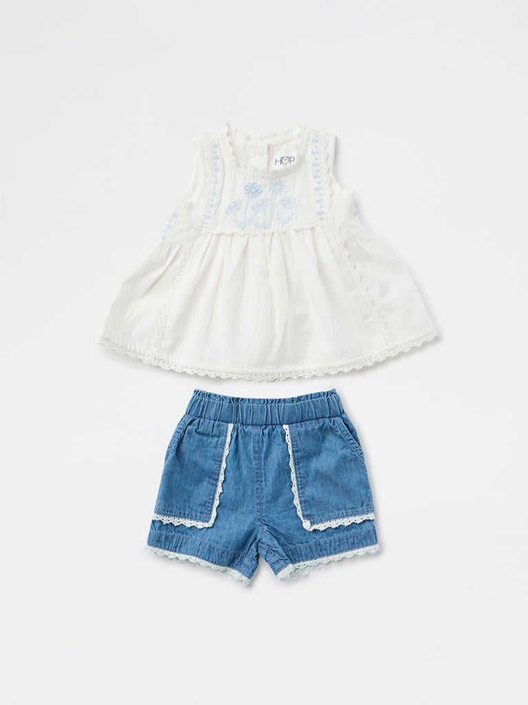Sweet and stylish, this set from HOP Baby pairs a crisp white cotton top with denim-style shorts. The sleeveless top features delicate blue floral embroidery, lace trims, and a button-down back, while the shorts come with an elasticated waistband and lace-trimmed pockets. Crafted from soft, breathable fabric, it’s a charming choice for warm-weather days.