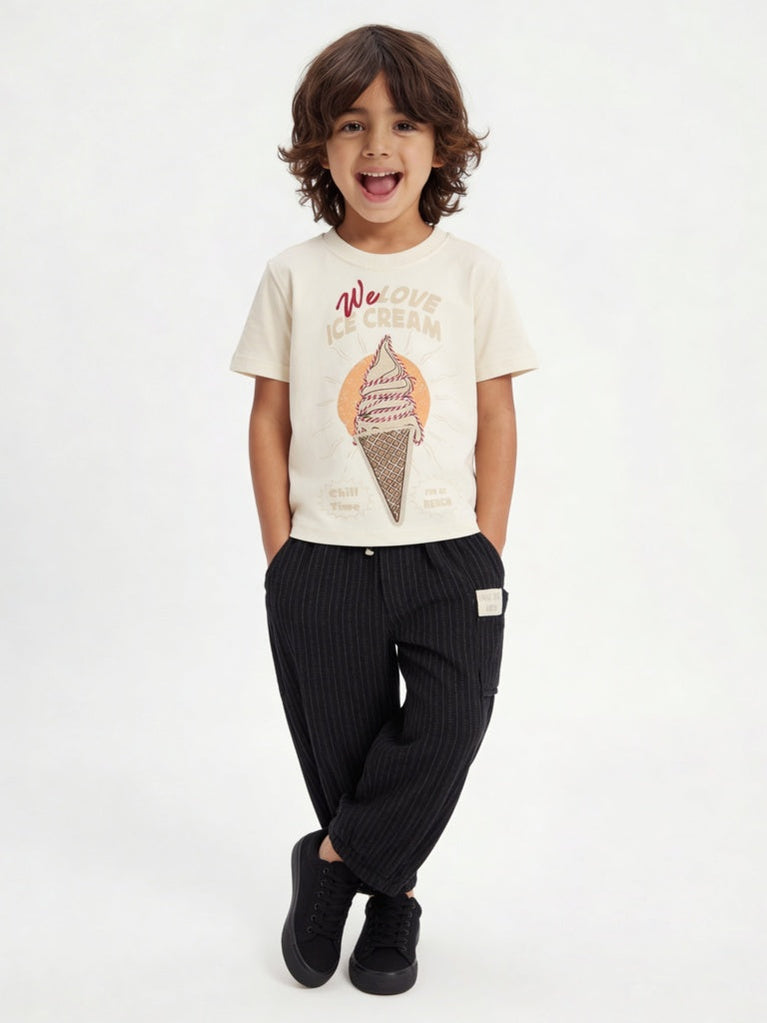 Serve up cheerful summer vibes with this cream t-shirt from HOP Kids. Designed with a playful ice cream graphic and vibrant lettering, it captures the carefree spirit of sunny days and sweet treats. Crafted from a cotton-rich fabric for everyday comfort, it features a classic crew neck and short sleeves.
