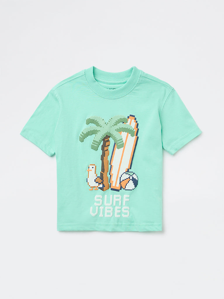 HOP Kids Boys Sea Green Printed Cotton T-Shirt