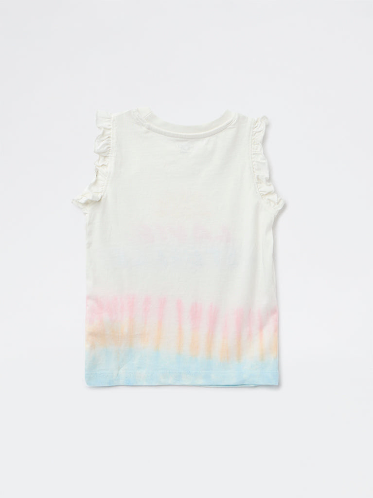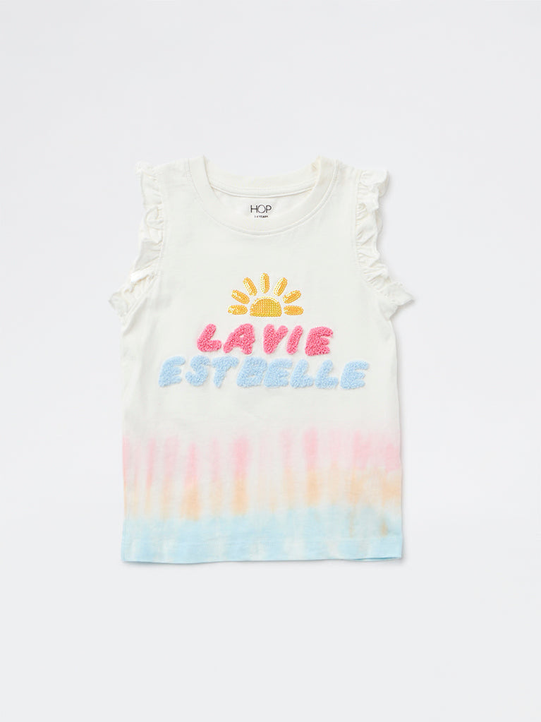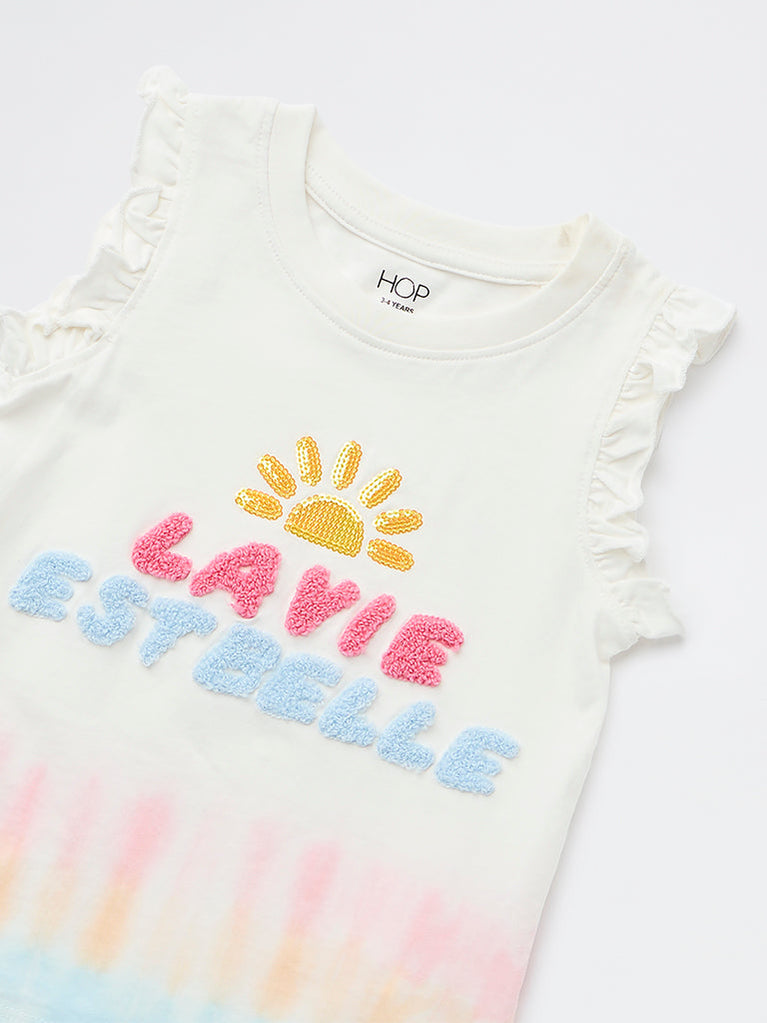 This vibrant white top from HOP Kids is crafted from soft cotton, featuring a colourful tie-dye effect along the hem in multicolour hues. Designed with a round neck and a Ruffled Sleeves silhouette, it is finished with playful ruffled trims at the shoulders. A sequinned graphic with text detailing on the chest adds a bright, cheerful touch.