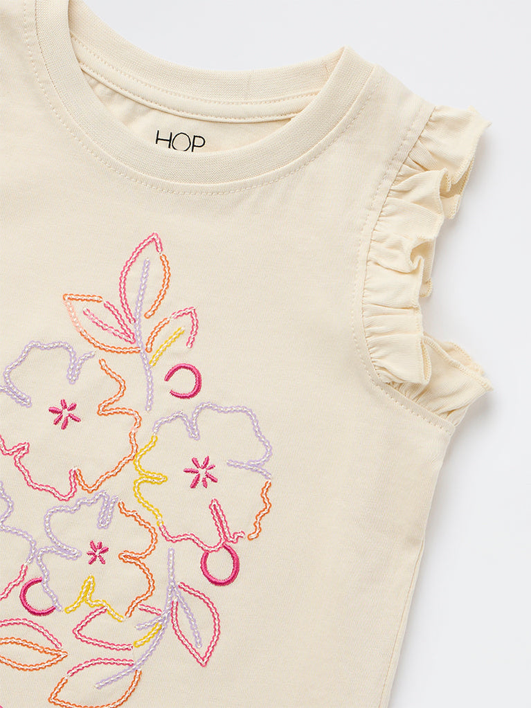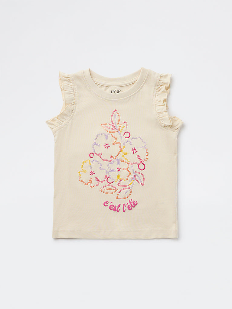 HOP Kids Girls Beige Floral Embroidered Cotton Top