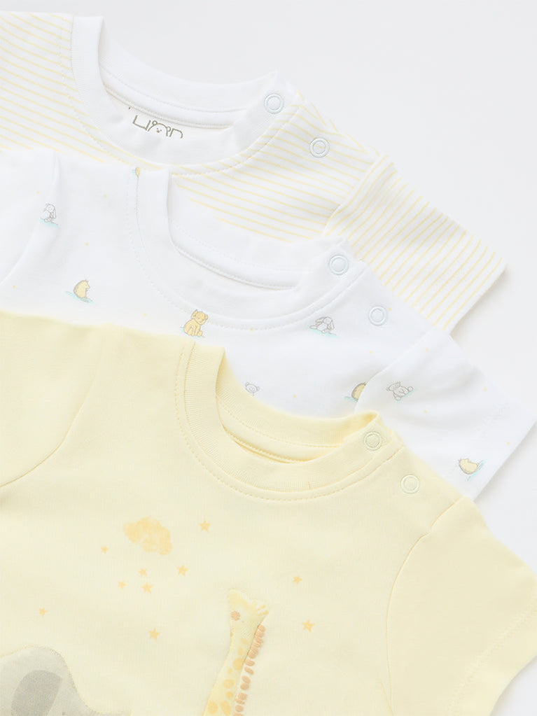 HOP Baby introduces this set of three T-shirts crafted from pure cotton fabric for everyday comfort. One features a cheerful yellow base with playful animal prints, while the others include a classic white variant and a striped design. The crew neckline and short sleeves ensure ease of movement, making them a bright and comfortable choice for little ones.
