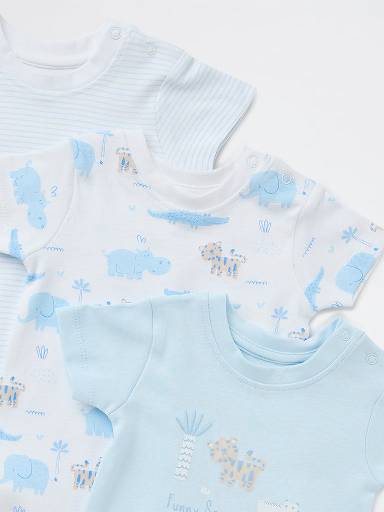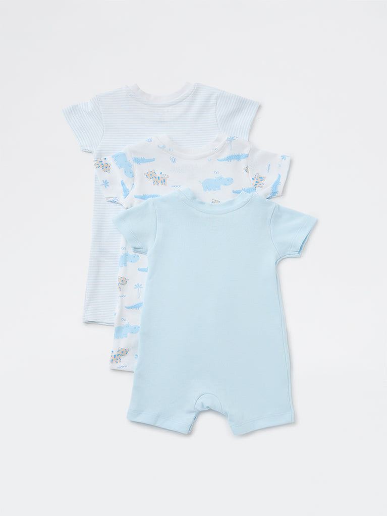 HOP Baby Boys Blue Printed Cotton Romper - Pack of 3
