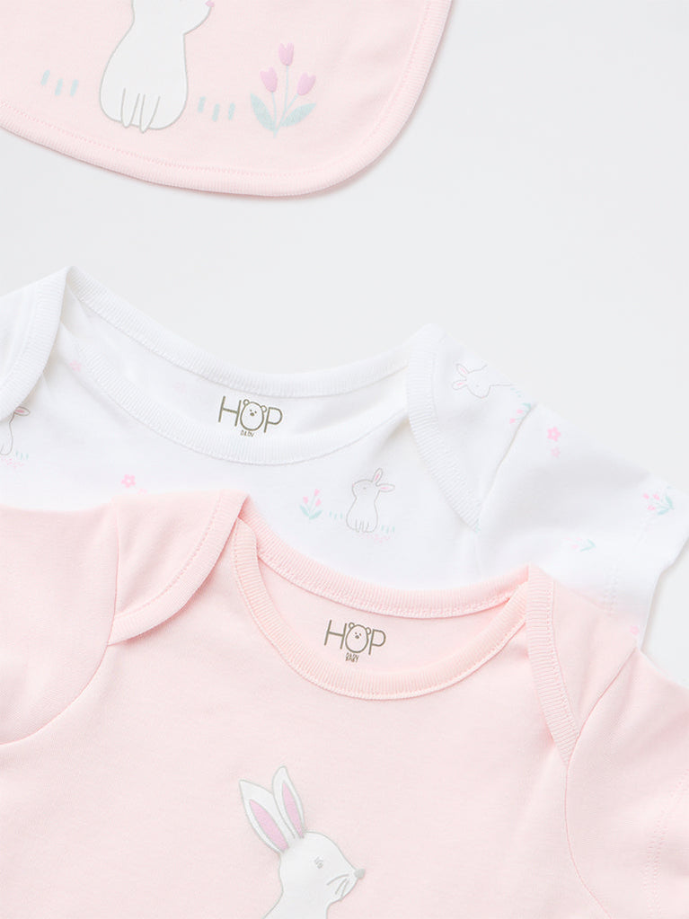 HOP Baby presents this adorable set featuring two cotton rompers and a matching bib, crafted from soft, breathable fabric for everyday comfort. The rompers come in gentle pastel pink and white tones, with one styled with a playful graphic print and the other detailed with subtle all-over accents. Designed with round necks, short sleeves, and snap-button closures at the crotch, they ensure easy dressing, while the coordinating bib completes this sweet and practical set.